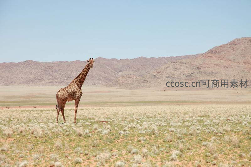 一只高大的长颈鹿独自站立在干燥的荒漠草原中,背景是连绵的红褐色山脉和湛蓝天空,展现出非洲野生动物的原始与孤寂之美。