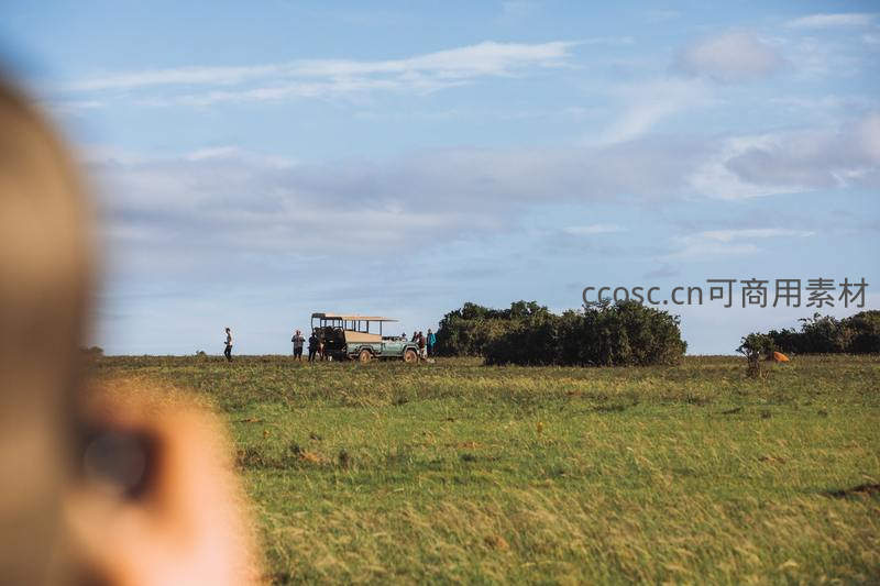 广袤草原上,游客们聚集在敞篷越野车旁,享受着开阔视野下的自然风光,远处灌木丛中隐约可见野生动物身影。