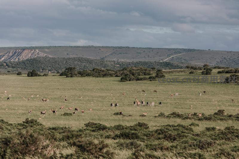 广袤草原延伸至远山脚下,各类野生动物悠闲散布其间,低矮灌木点缀其中,云层密布下更显大自然的苍茫与活力。