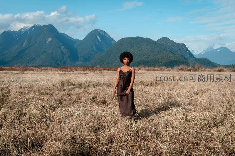 一位身着深色长裙的女性静立于广阔枯草原野,背景是连绵起伏的青翠山脉与晴朗蓝天,氛围宁静而充满力量。