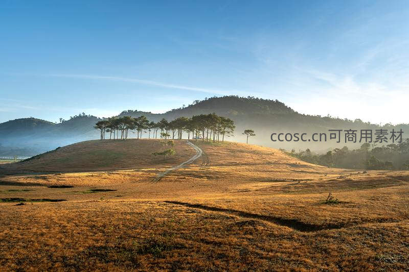 金色阳光铺满起伏的山坡,一排挺拔的松树矗立山顶,薄雾弥漫山谷,一条小径蜿蜒而上,画面温暖而宁静。