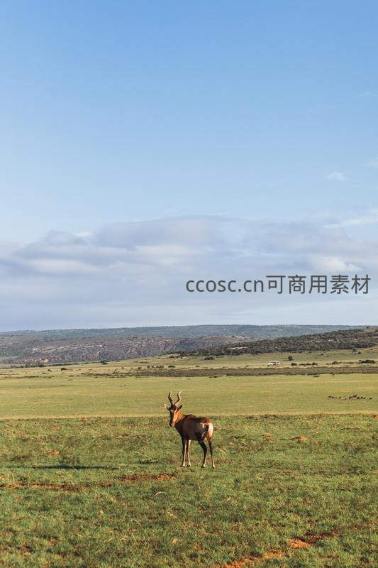 一只羚羊独自站立在广袤无垠的绿色草原上,背景是辽阔的天空与远处的丘陵,尽显大自然的空旷与生命的孤寂。