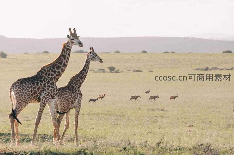 两只长颈鹿在夕阳余晖下并肩漫步于无垠草原,远处还有其他动物的身影,共同描绘出非洲大草原的生机与温情。