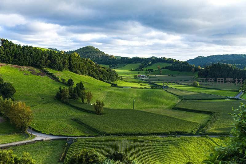 连绵起伏的翠绿山丘与整齐农田交织,远处村落点缀其间,天空云卷云舒,构成一幅生机勃勃的田园风光图景。
