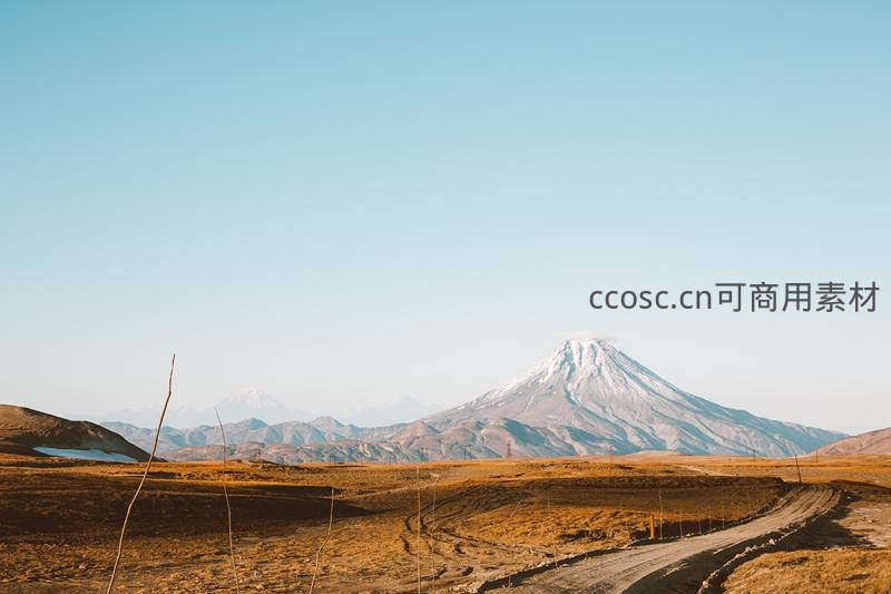 一条尘土小径从前景延伸,引导视线至远处高耸入云的雪峰,广袤无人的荒原更显大自然的宏伟与孤寂感。