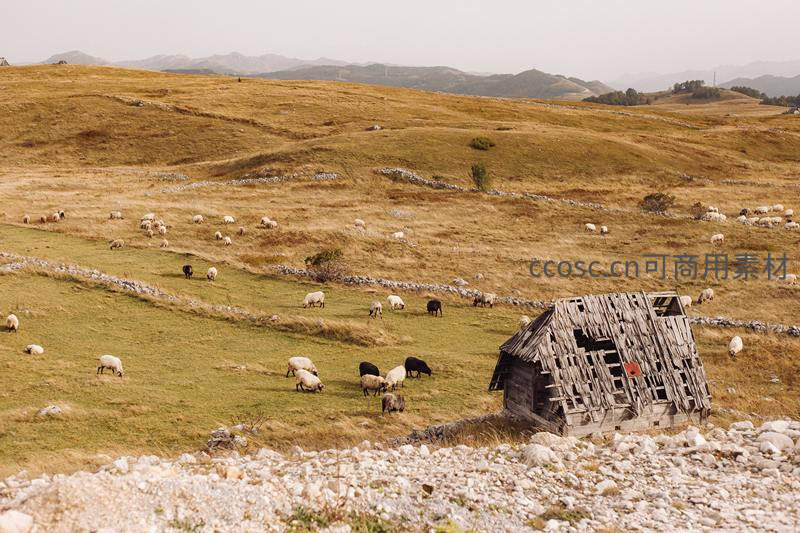 在起伏的黄绿色草坡上,一群羊悠闲地吃草,旁边一座破败的木屋诉说着岁月沧桑,远处山峦朦胧。