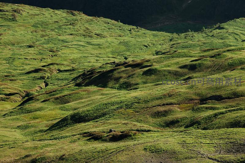 阳光斜照在连绵起伏的绿色山丘上,光影交错勾勒出大地的肌理,展现出自然原始而壮阔的美感。