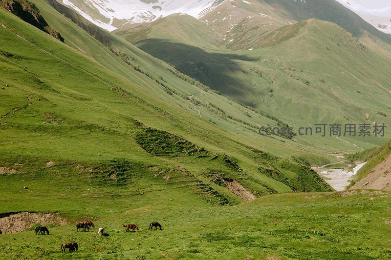 在白雪皑皑的高山环抱下,一片广阔的绿茵草地上,几匹马儿正低头吃草,远处溪流蜿蜒,景色壮美。