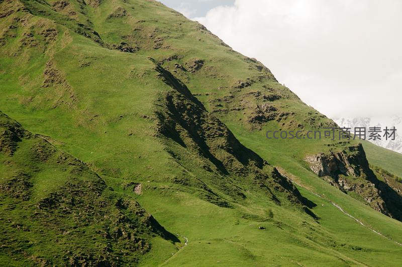 陡峭绿坡映衬雪峰云海