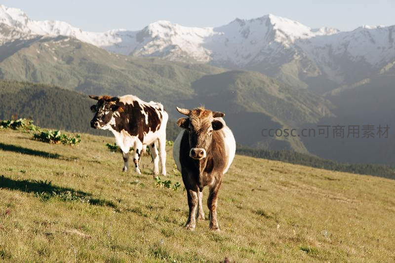 两头牛在青翠山坡上悠闲漫步,背景是连绵白雪覆盖的巍峨山脉,构成一幅宁静和谐的高山牧场画卷。