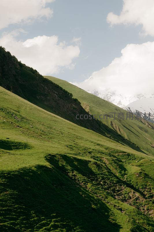 阳光与阴影在起伏的绿色山脊上交织,远处隐约可见雪峰,蓝天白云下尽显大自然的雄伟与柔美。