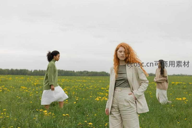 三位风格各异的女性在开满黄花的绿野中漫步或凝视镜头,自然光线下衣着与环境相得益彰,充满文艺气息。