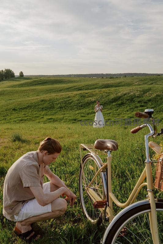 夕阳下,一名男子蹲在复古自行车旁,目光投向远处草地上伫立的白衣女子,构成一幅充满故事感与温柔氛围的画面。