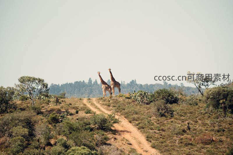 两只长颈鹿站在干燥的山丘顶端,背对镜头眺望远方,它们修长的身影与广袤的灌木丛和土路共同构成壮阔的非洲野景。