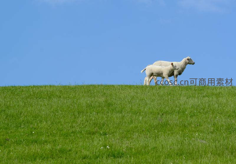 一只成年绵羊带着它的小羊羔,悠闲地漫步在翠绿的山坡顶端,身后是纯净无瑕的蓝色天空,画面温馨而充满田园诗意。