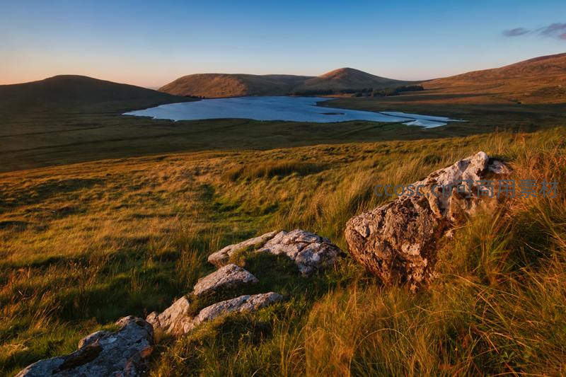 晨曦洒满起伏的草原,金色光芒照亮了湖面与远处的山峦,前景的岩石为这幅宁静画卷增添了质感。