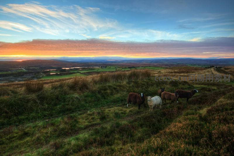 几只绵羊静静伫立在山丘之上,凝望着远方绚烂的夕阳,身后是广袤无垠的田野和温柔的暮色。