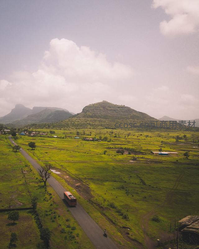 从高空俯瞰,一辆红色巴士行驶在蜿蜒的乡间公路上,四周是广袤的绿色农田和远处层叠的山峦,充满生机与动感。