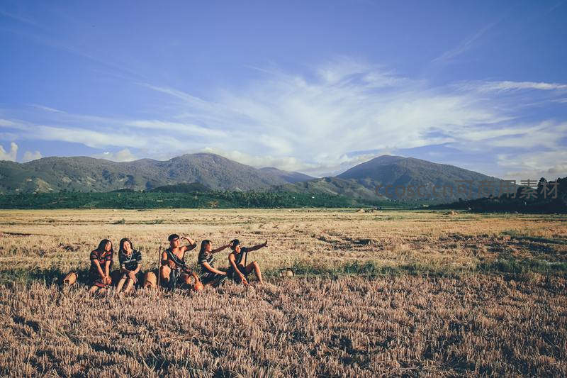 五位朋友坐在收割后的稻田里,面带笑容指向远方连绵青山,在晴朗蓝天下记录下难忘的旅行瞬间。