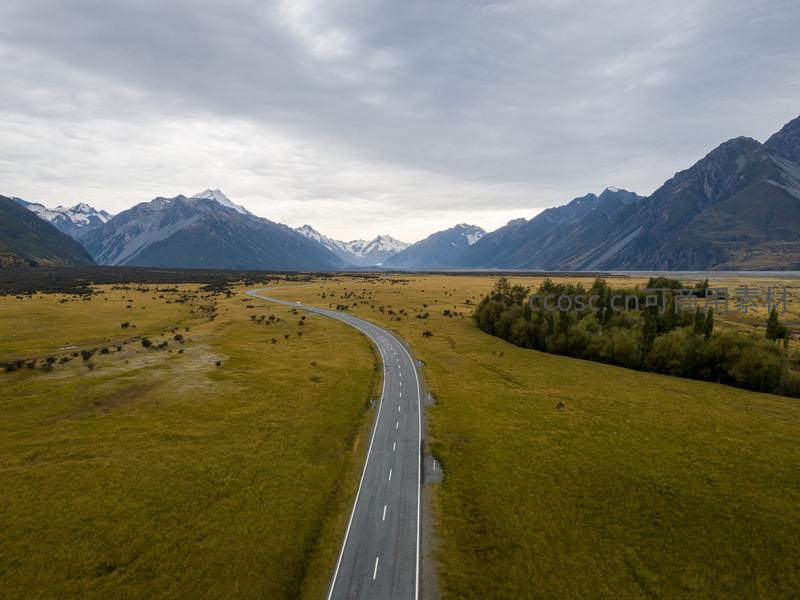 从高空俯瞰一条笔直公路蜿蜒穿过金黄草原,远处雄伟雪山连绵,展现壮丽自然与人类工程的和谐交融。