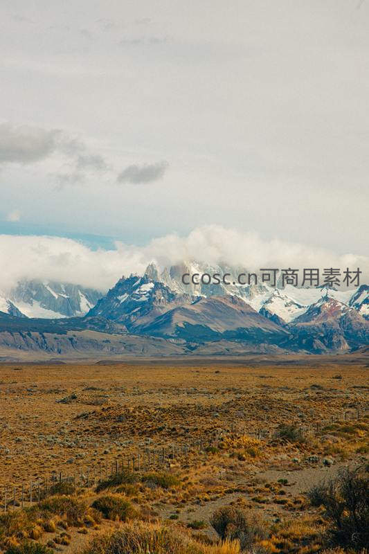 连绵的雪山峰顶被流动的云雾半遮半掩,山脚下是广袤无垠的棕色荒原,展现出原始而苍凉的自然力量与极致的视觉震撼。