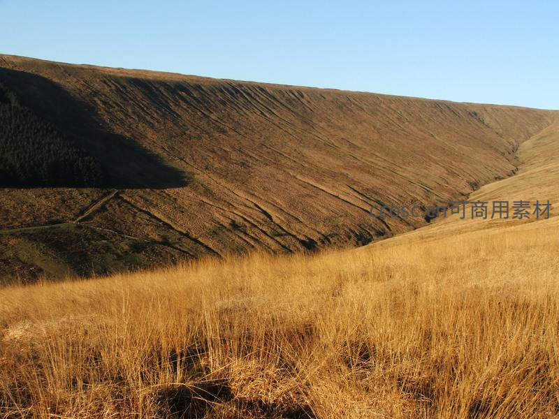 温暖的阳光倾泻在起伏的山谷上,将干枯的草地染成一片金黄,清晰的阴影勾勒出山体的轮廓,展现大地粗犷而静谧的美。
