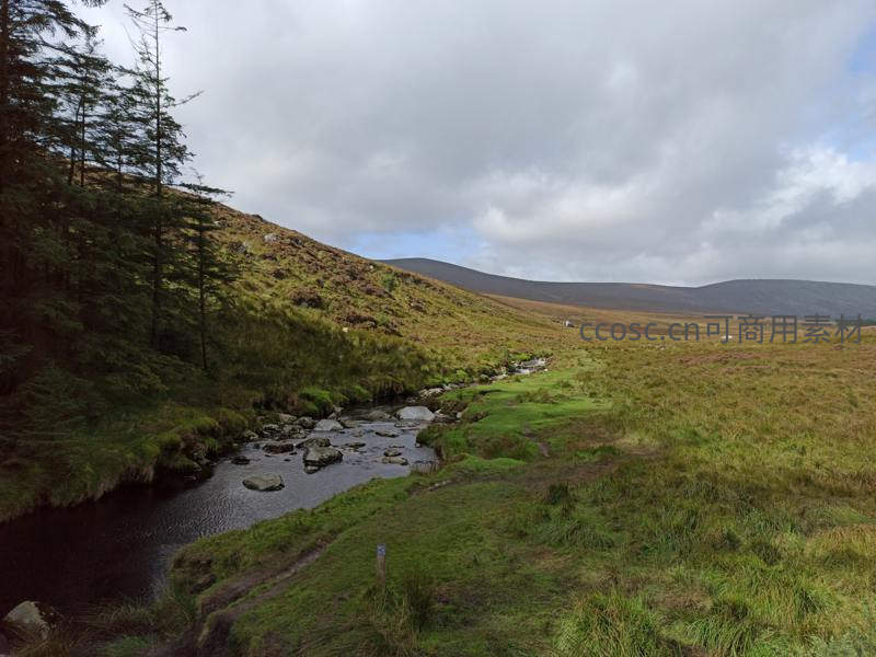 一条清澈的小溪在青翠的山坡和茂密的松林间蜿蜒流淌,周围是开阔的草地和远处朦胧的山峦。