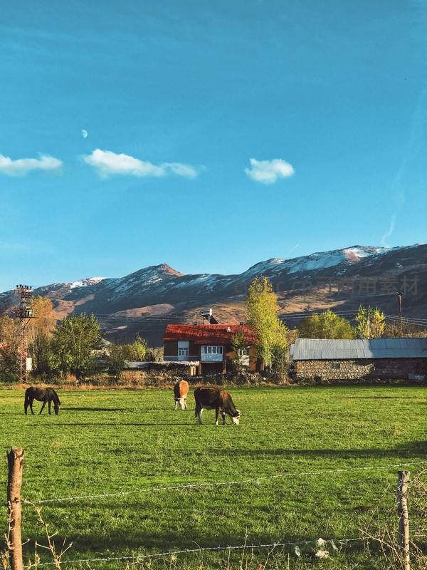 几匹马在阳光明媚的绿色草地上悠闲吃草,背景是白雪皑皑的远山、红顶房屋和一弯新月高悬的蓝天。