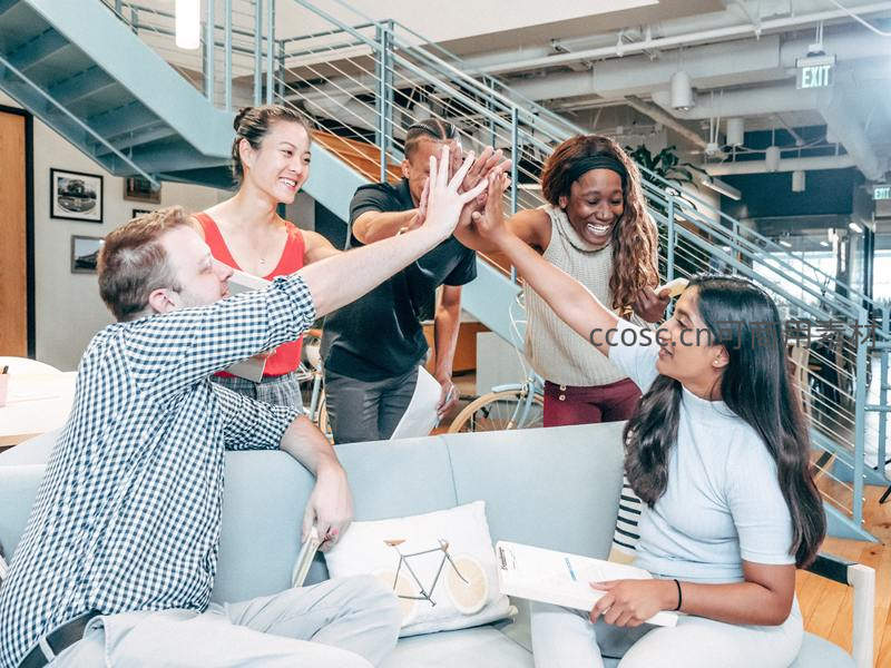 一群充满活力的跨文化团队成员在开放式办公室里开心击掌,共同庆祝项目取得阶段性成果,氛围热烈。