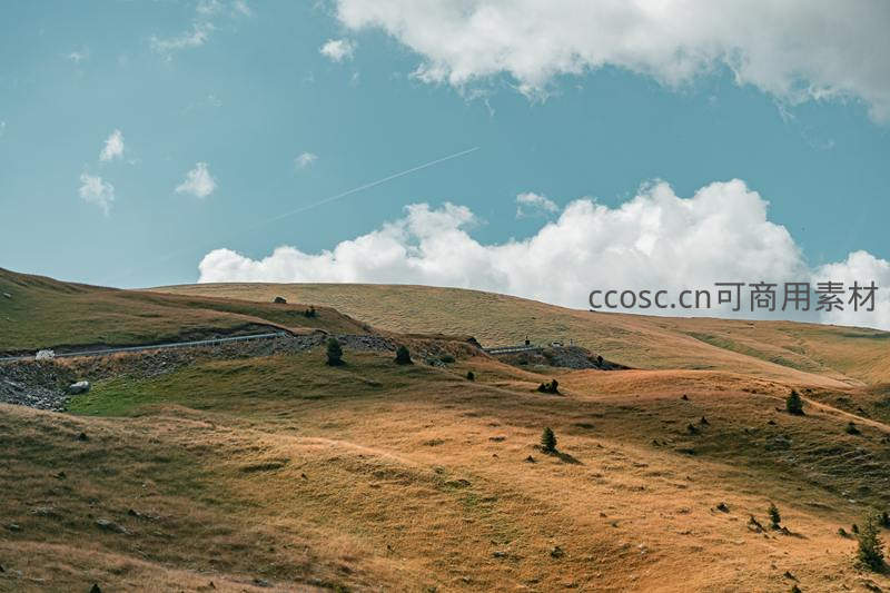 秋日暖阳下,金黄色山丘起伏连绵,一条公路蜿蜒其上,蓝天白云投下斑驳光影,展现辽阔而温暖的高原风光。