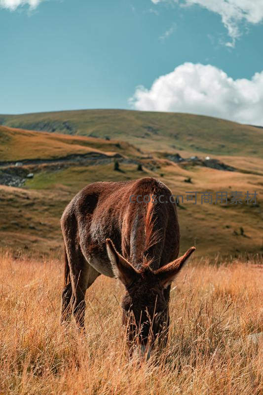 一头棕色毛驴在秋日金黄草地上低头专注吃草,背景是连绵山丘与蓝天白云,画面洋溢着质朴宁静的田园气息。