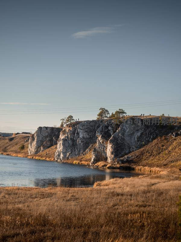湖畔悬崖峭壁,游人点缀壮丽风景