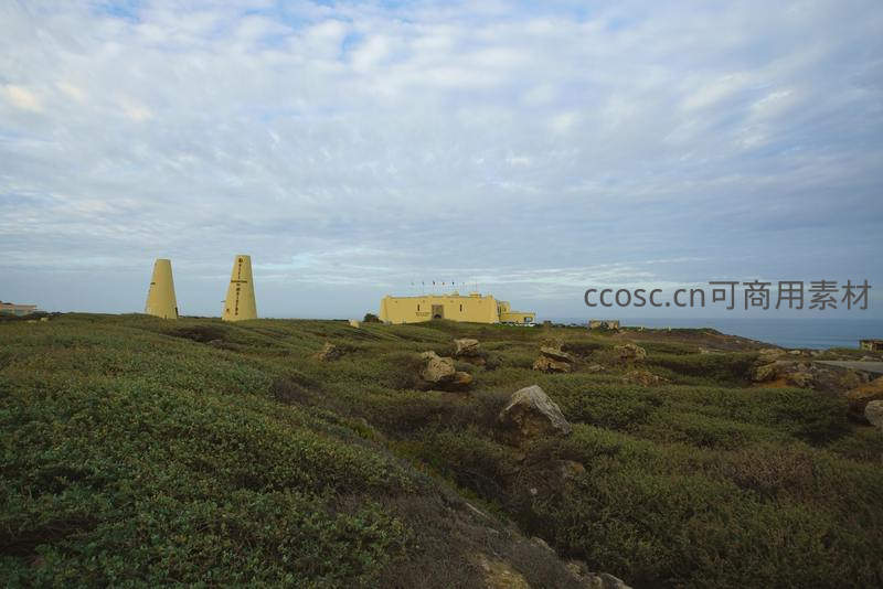 一座古老的黄色堡垒矗立在临海的绿色灌木丛中,两座锥形塔楼静静守望,诉说着昔日的海防历史与沧桑岁月。