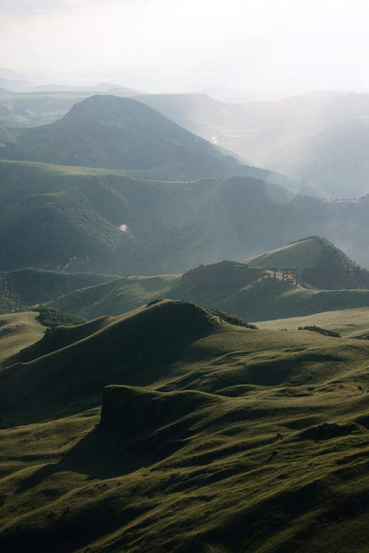 清晨阳光穿透薄雾,洒在层层叠叠的翠绿山丘上,营造出宁静而壮丽的自然画卷,令人心旷神怡。
