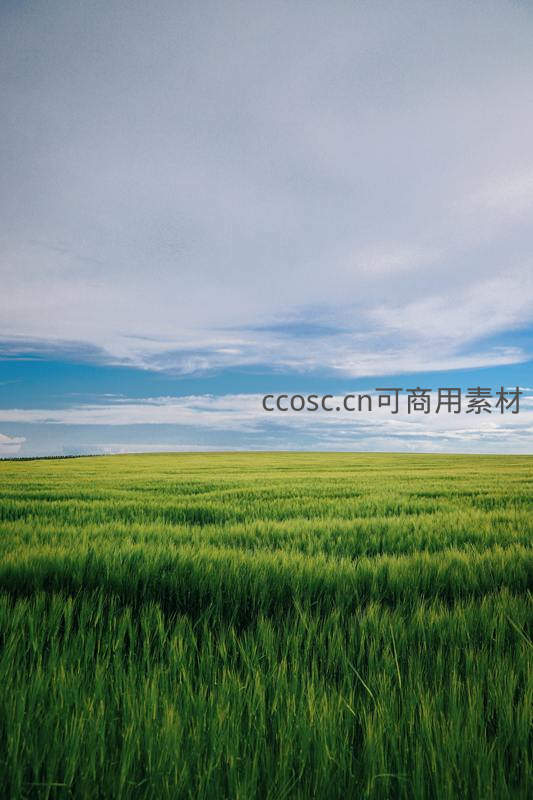 一望无际的翠绿麦田延伸至天边,与纯净的蓝天白云相接,展现出大自然的辽阔与宁静,充满生机与希望。