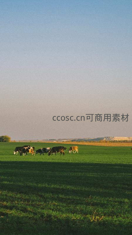 几头奶牛在广阔无垠的翠绿草地上悠闲吃草,远处地平线朦胧,天空澄澈,构成一幅宁静的田园牧歌图。