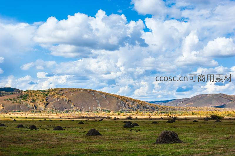 广袤的绿色草原上散布着一个个深褐色的干草垛,背景是覆盖着稀疏秋叶的山丘和蓬松的蓝天白云。