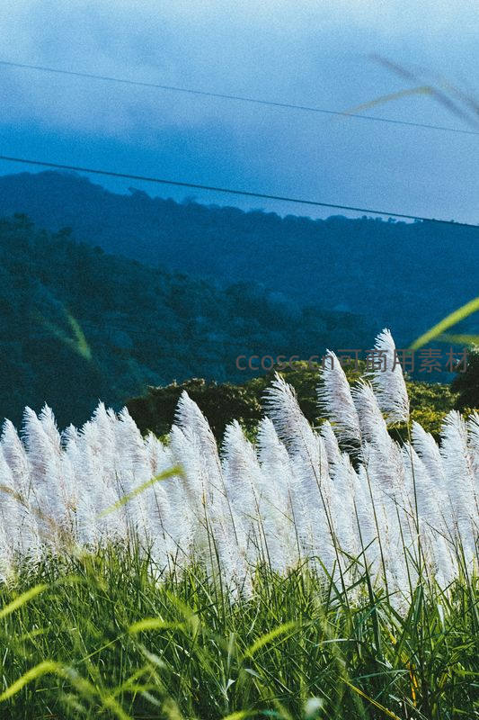 洁白如雪的芦花在绿草丛中绽放,背景是苍翠山峦与湛蓝天空,清新自然,充满生机与诗意。