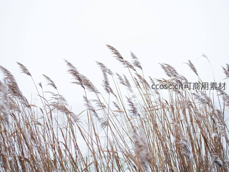 冬日清晨的芦苇挂满薄霜,在淡白天空下显得清冷孤寂,展现冬季特有的静谧与坚韧之美。