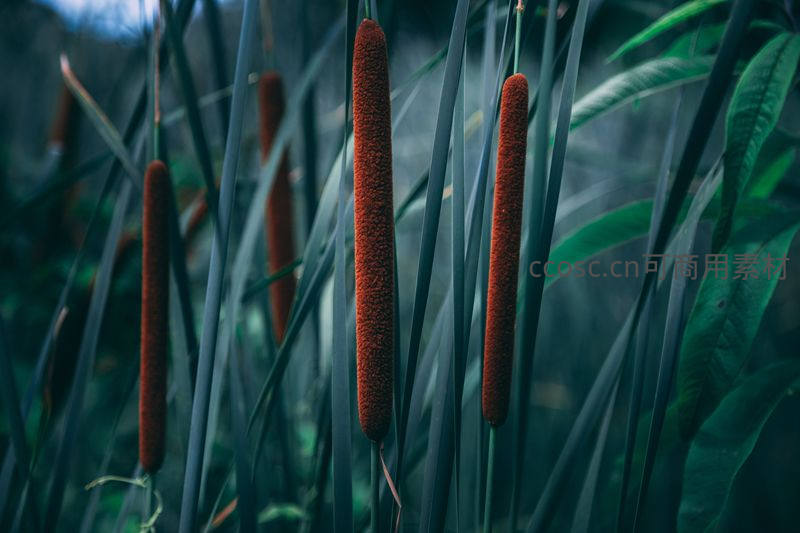 在薄雾笼罩的湿地中,几株香蒲挺立,棕红色的花穗与青翠的叶片形成鲜明对比,营造出宁静而富有生机的自然景象。