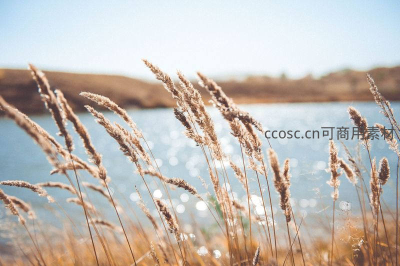 湖岸的芦苇在微风中轻轻摆动,身后是波光粼粼的水面,阳光洒落其上闪烁点点金光,构成一幅恬静、温暖且充满诗意的湖畔风光。