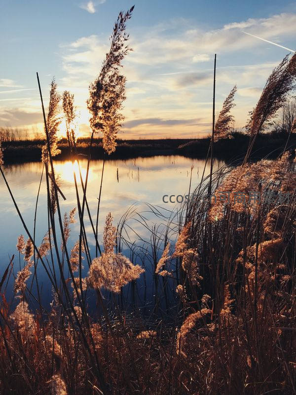 金色夕阳下,湖面波光粼粼,芦苇随风轻摇,构成一幅宁静而唯美的自然画卷。