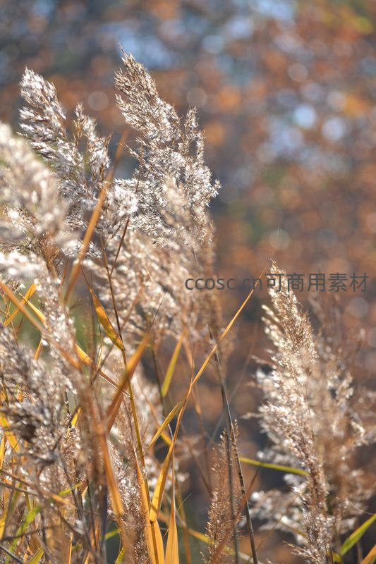温暖的秋日阳光穿透芦花,使其在虚化的彩色背景前熠熠生辉,尽显季节更迭的温柔与绚烂。