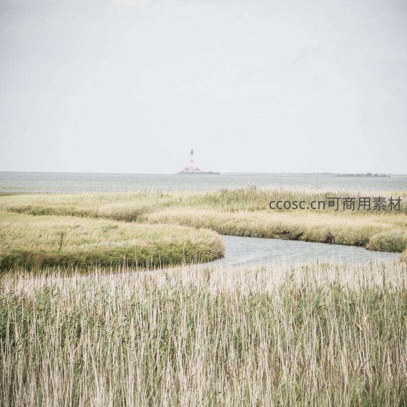 湿地水道蜿蜒穿过芦苇荡,远方灯塔若隐若现