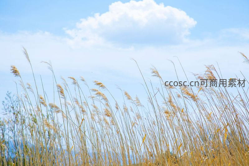 金黄芦苇随风起伏,朵朵白云点缀碧空如洗