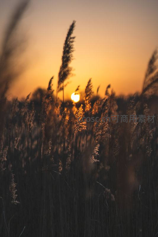 夕阳西下,金色光芒浸染整片芦苇荡,植物轮廓在强光下形成鲜明剪影,呈现出温暖而富有诗意的黄昏景象。
