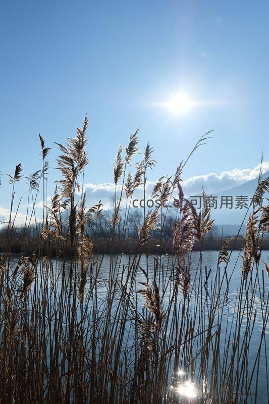 湖畔芦苇剪影映衬耀眼骄阳