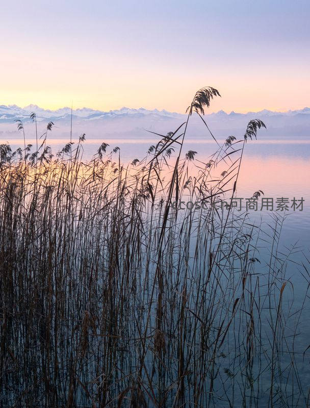 湖畔芦苇剪影映霞光山峦