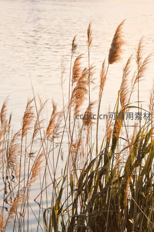 夕阳余晖洒在湖边芦苇上,金红色的穗子与粼粼水波相映成趣,营造出温暖静谧氛围。