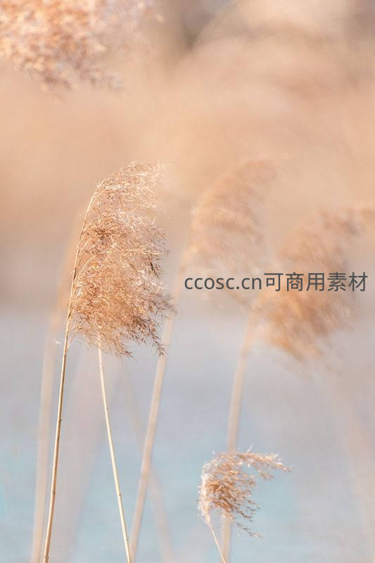 虚化的背景与清晰的芦苇形成层次,柔和光线与淡蓝色调共同营造出梦幻般的诗意氛围。